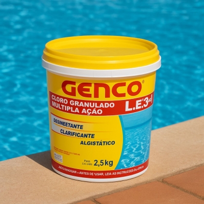 GENCO L.E. Cloro Granulado Múltipla Ação 3 em 1 Desenvolvido especialmente para quem procura praticidade aliada à qualidade, pois além de ser um poderoso agente desinfetante para águas de piscinas (cloro com estabilizante), clarificante, algicida e algistático. Indicado para piscinas residenciais. Cloro estabilizado - elimina os microorganismos causadores de doenças presentes na água, antes que infectem os usuários ou se multipliquem. Por ser estabilizado (possui proteção contra os raios UV) dura muito mais tempo na água da piscina. Clarificante - mantém a água da piscina cristalina e aumenta o desempenho do filtro de areia. Algicida e algistático - elimina e previne o surgimento de algas. Embalagem: 2.5 kg Validade: 2 anos após a data de fabricação |