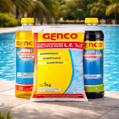 - 01 Cloro Granulado Múltipla Ação L.E ( 3x1 ) 1kg - 01 Clarificante Genfloc 1L - 01 Algicida de Manutenção 1L