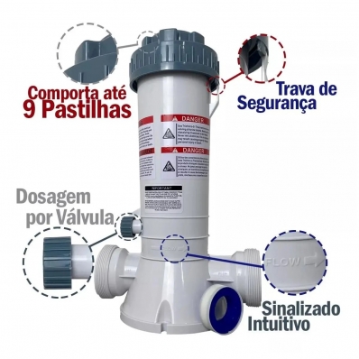 | O Clorador Automático de Pastilhas é projetado para instalação na linha de retorno da piscina. É adequado para uso exclusivo com tabletes ou pastilhas de cloro de baixa dissolução (tricloro). Tem capacidade para até 9 tabletes grandes de 200 gramas ou aproximadamente 1,9 kg de pastilhas menores e possui uma válvula reguladora do fluxo de água através do clorador. Essa capacidade, sob condições normais, deve proporcionar cerca de 14 dias de cloração contínua para piscinas com volume de 140.000 litros. É importante acompanhar o residual de cloro livre disponível na água. Dosador Automático de Cloro para Piscinas e Spas - Mantenha sua água sempre cristalina! O dosador automático de cloro é a solução ideal para manter sua piscina ou spa sempre limpos e desinfetados. Com design moderno e fabricado com materiais plásticos de alta qualidade, você terá um produto durável e eficiente. O dosador é projetado para ser instalado na linha de retorno do sistema de filtração, podendo ser posicionado acima ou abaixo da linha d'água. Ele trabalha em conjunto com as pastilhas de cloro de baixa dissolução (tricloro-s-triazina-triona) e é capaz de proporcionar uma cloração contínua e uniforme por várias semanas, sem a necessidade de recargas frequentes. Principais benefícios: Dispensa manualmente o cloro, proporcionando praticidade e conveniência. Capacidade de carga generosa e fácil controle da válvula de dosagem, garantindo uma cloração eficiente. Adequado para piscinas de diversos tamanhos, garantindo uma dispersão uniforme em todo o volume de água. Eficiente tratamento de desinfecção, garantindo uma água limpa e segura para uso. Instruções de instalação e uso: CARACTERÍSTICAS: Material: Materiais Plásticos Inalteráveis (ABS) Dimensões: 39 cm x 21 cm x 12,5 cm Peso: Capacidade aproximada de 2 kg (até 10 pastilhas de cloro de 200g cada) Instalação: O dosador de cloro deve ser instalado exclusivamente na linha de retorno do sistema de filtração, após o filtro ou aquecedor, se houver. Certifique-se de que a água flua livremente, sem obstruções, desde a saída do dosador até a piscina. Utilize tubos de qualidade e mantenha o mesmo diâmetro de tubulação da saída do dosador até a piscina. Evite o uso de tubulação ou acessórios de cobre para a instalação. Fixe o dosador ao piso ou a uma base firme e nivelada feita de material não corrosivo. Certifique-se de que a altura do dosador esteja acima do nível máximo da piscina e abaixo da linha da multiválvula do filtro para evitar o retorno de cloro quando o dosador não estiver em funcionamento. Caso o dosador seja instalado em áreas abaixo do nível d'água da piscina, recomendamos a instalação de registros de "fechar e abrir" antes e depois do dosador para facilitar a recarga. É também aconselhável a instalação de uma válvula de retenção para proteger o equipamento de filtração contra corrosão química quando o dosador estiver desligado. IMPORTANTE: -Antes da instalação, verifique a flecha de sentido de fluxo no dosador. -Faça as conexões de forma hermética e segura para evitar vazamentos. -Realize uma prova de funcionamento antes de carregar o dosador com cloro. -Por questões de segurança, evite instalar o dosador em áreas expostas à chuva, luz solar direta ou locais suscetíveis a choques ou impactos. -Proteja o dosador da luz solar direta para garantir sua durabilidade e eficiência. -Invista em um dosador automático de cloro e desfrute de uma água sempre cristalina e saudável em sua piscina ou spa. Garanta a qualidade e a praticidade que você merece! ITENS INCLUSOS: 01 - Dosador de cloro automático 01 - Base Plástica 01 - Adaptador de Entrada 01 - Adaptador de Saída 01 - Fita de Vedação |