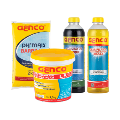 - 01 Balde de Cloro Granulado Múltipla Ação L.E ( 3x1 ) 2,5kg - 01 Barrilha pH Mais 2kg - 01 Clarificante Genfloc 1L - 01 Algicida de Choque 1L